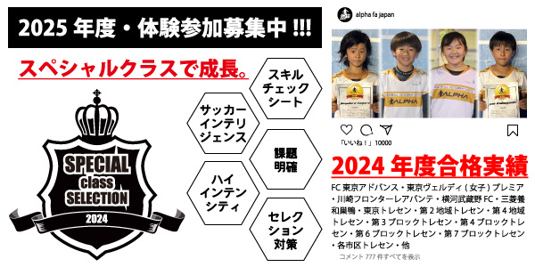 アルファFA最上級クラスとして、ハイレベルな選考基準をクリアしたメンバーのみで構成されたクラスとなります。「高強度の中でトレーニングの質を追求する」ことに併せて「優秀な選手がたくさん集い切磋琢磨できる環境」を目指していきます。4〜6年生、早期段階からの育成に努めていきます。ジュニアユースのみならずジュニア年代のより高いステージへとサポートする。アルファFA独自のエリートクラスの形を創造します。
